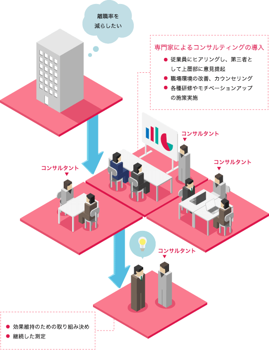 経験豊富で国家資格を保有したコンサルタントがお悩み事のヒアリング・施策のご提案・アフターケアなど組織の実情やご要望に合わせた支援を行います。