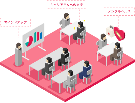 従業員の資質向上や意識改革には、モチベーションをアップさせる研修の実施などによるマインドアップ、キャリア自律への支援などを行います。