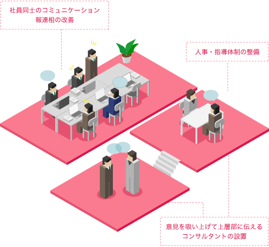 企業・働く人・職場環境・風土といった組織を形成する全ての側面にアプローチし、当社の経営理念である『企業と働く人の共存共栄』をともに作りあげる組織作りをコンサルティングいたします。