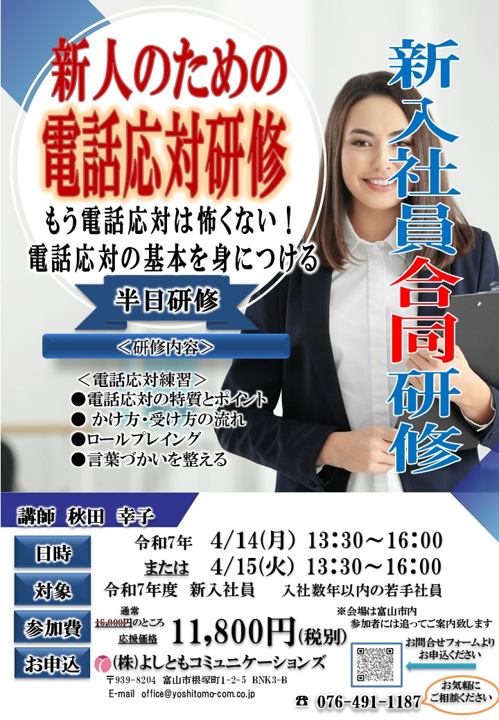 令和7年度新入社員合同研修開催のお知らせ 4月 半日 電話応対研修