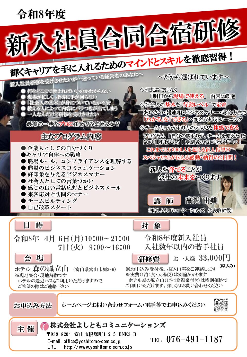 令和8年度 新入社員合同合宿研修開催のお知らせ お知らせ 新入社員の意欲と吸収力が高い“今”だからこそ、意味がある研修です。チーム力・かかわり力の本質を、体感を通して腹落ちさせます。一人ひとりの関わりが、職場の空気と成果を左右していることに気づく2日間。わかったつもりで終わらせず、行動が変わる実践型プログラム。人が育つ土台を早期につくることが、組織の未来への投資になります。 お気軽にお問合せ下さい