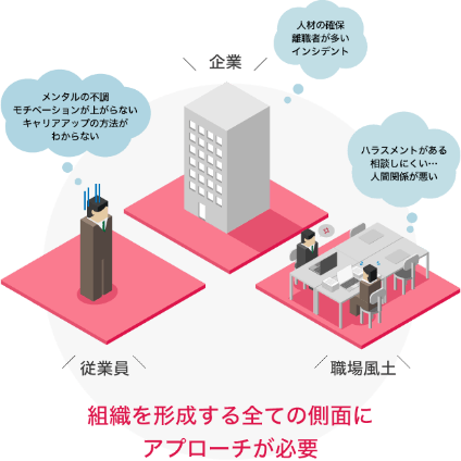 問題の一つを切り取って解決しても、根本的な解決にはなりません。企業、従業員の意識改革やメンタルケア、職場風土の改善など、… これらの組織を形成する全ての側面へのアプローチが必要です。