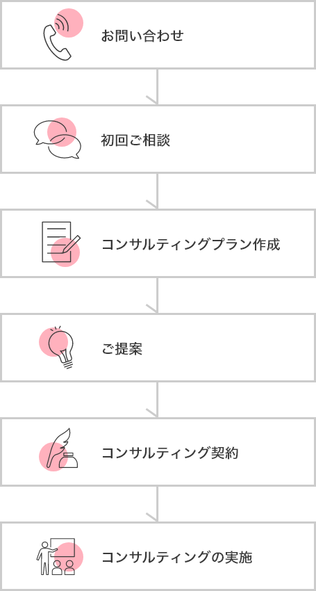 当社の組織作りコンサルティングでは、企業が抱えるお悩みをヒアリングし、問題の本質を明確にし、専門家としての助言・解決への道筋を立て、時には人事介入や組織改革をともに行い、カウンセリングや研修の実施・提案、また問題解決後の効果の維持・測定などのアフターケアまで行います。